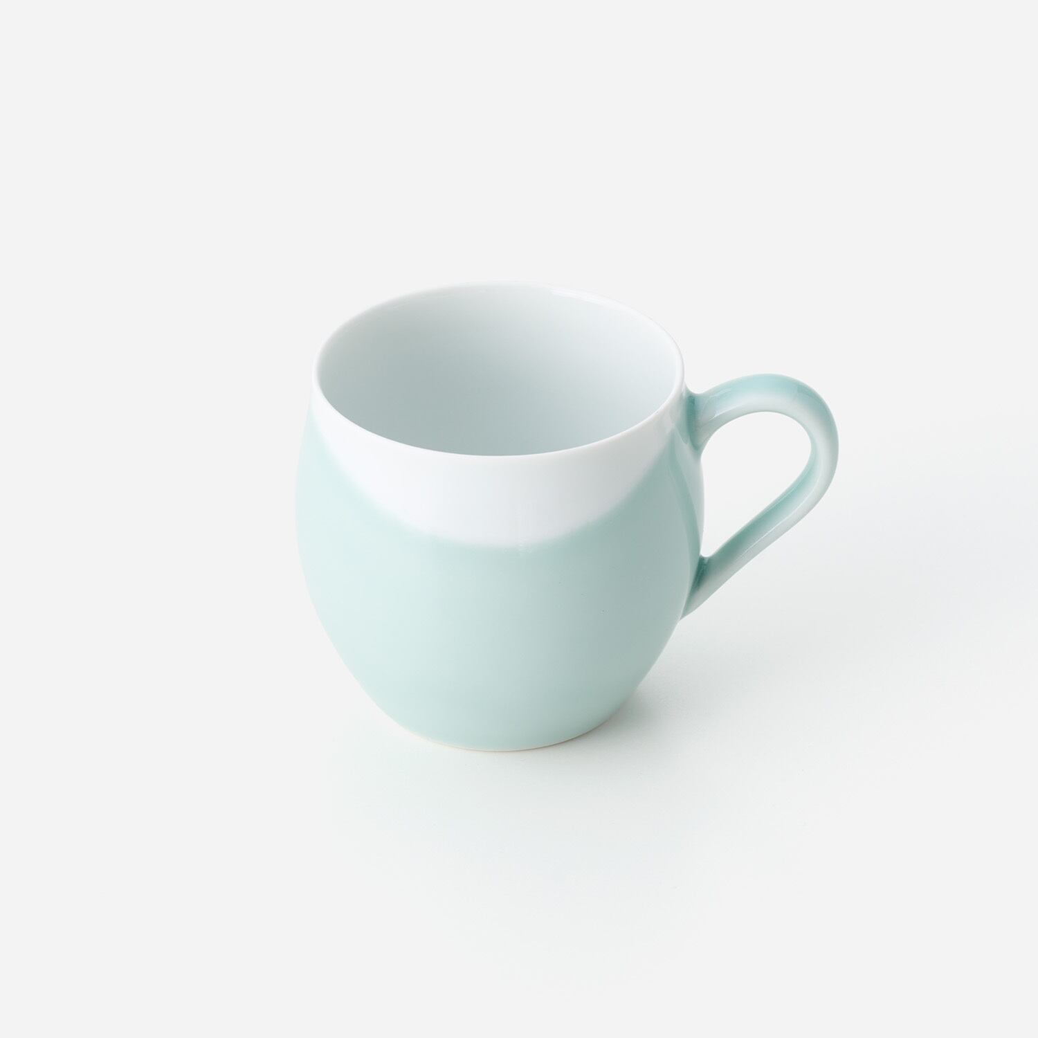 白磁の白と青磁のブルーのツートンデザインのマグカップです。